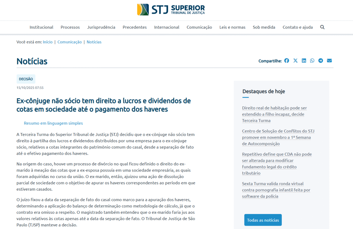STJ decide: ex-cônjuge não sócio tem direito a lucros e dividendos até o pagamento dos haveres